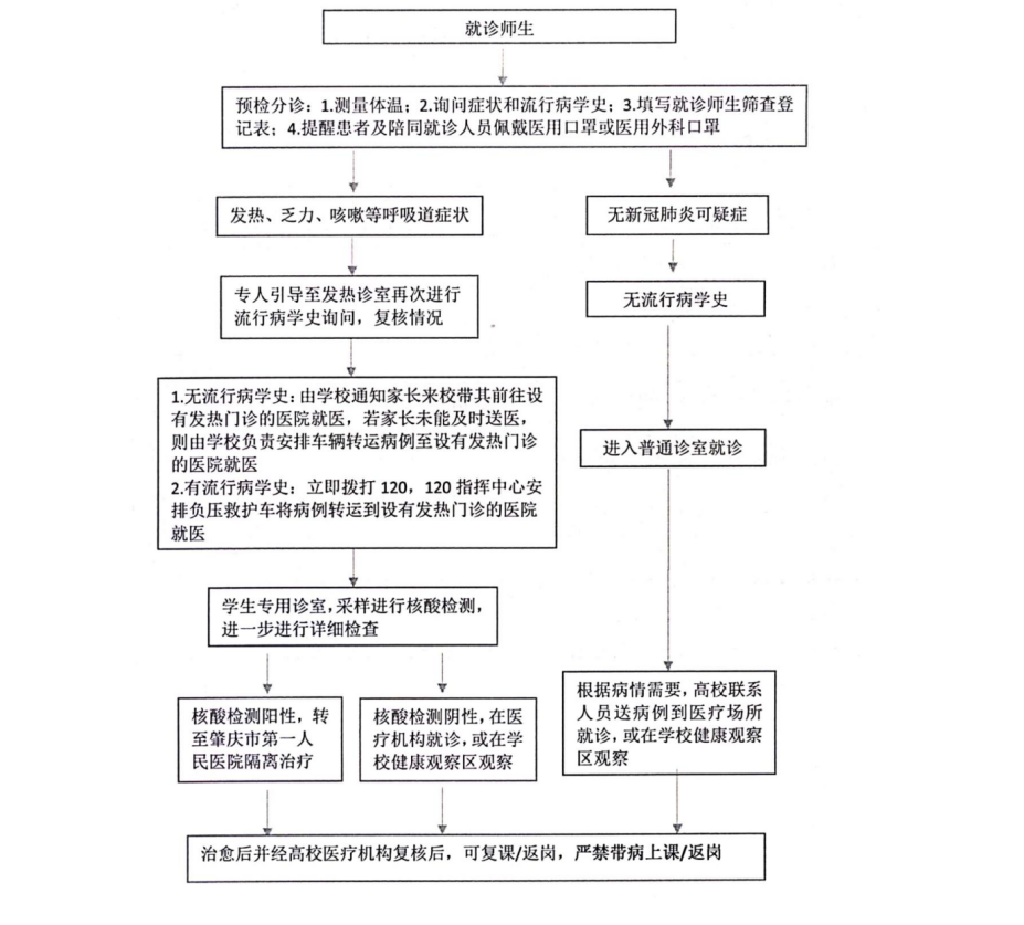 (7)若发现可疑病例,有前述流行病学史中的任一条,校医室将立即联系120,将患者转运到定点医院诊治,同时报告公司防控办、当地疾控中心,配合采取进一步的防控措施。