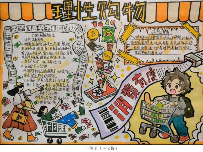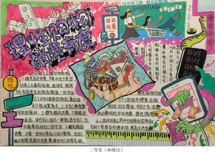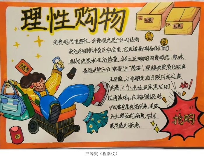 通过开展“理性购物,消费有度”手抄报活动,使同学们在双十一等购买消费的浪潮中保持头脑理性,切忌过度消费,冲动消费,不盲目,跟风不被消费主义裹挟,做消费主义市场的逆行者,引导同学们树立正确的消费观念。