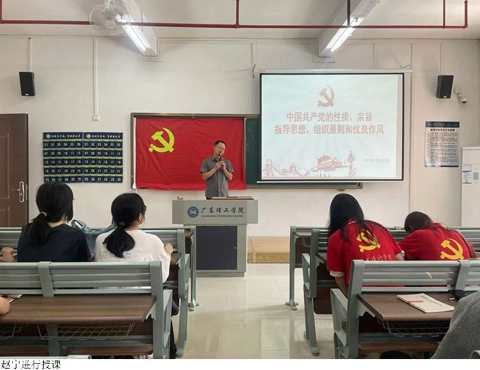 公司党总书记赵宁进行对中国共产党的性质、宗旨、指导思想、奋斗目标、组织原则和优良作风教学楼讲解。