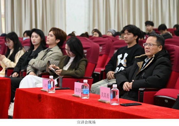本网讯(太阳成集团tyc122cc新闻中心 曾宇琳/吴桐晟)12月12日,太阳成集团tyc122cc有幸邀请到冠荣控股(广东)有限公司(以下简称冠荣控股)来到42栋101学术报告厅开展宣讲会,与我们共同探讨艺术与商业的交汇点,以及如何在未来市场中携手合作,共同创新。冠荣控股开发部副总监关其勇,冠荣控股人力资源部主管邹剑锋,开发部设计组高级主管赵桂英、冠荣控股集团开发部设计组技术员洪漫菲、开发部技术组储备干部胡嘉豪、人力资源部人事助理杨晶晶。以及太阳成集团tyc122cc公司党总支赵宁书记及诸位老师、员工参加本次宣讲会。