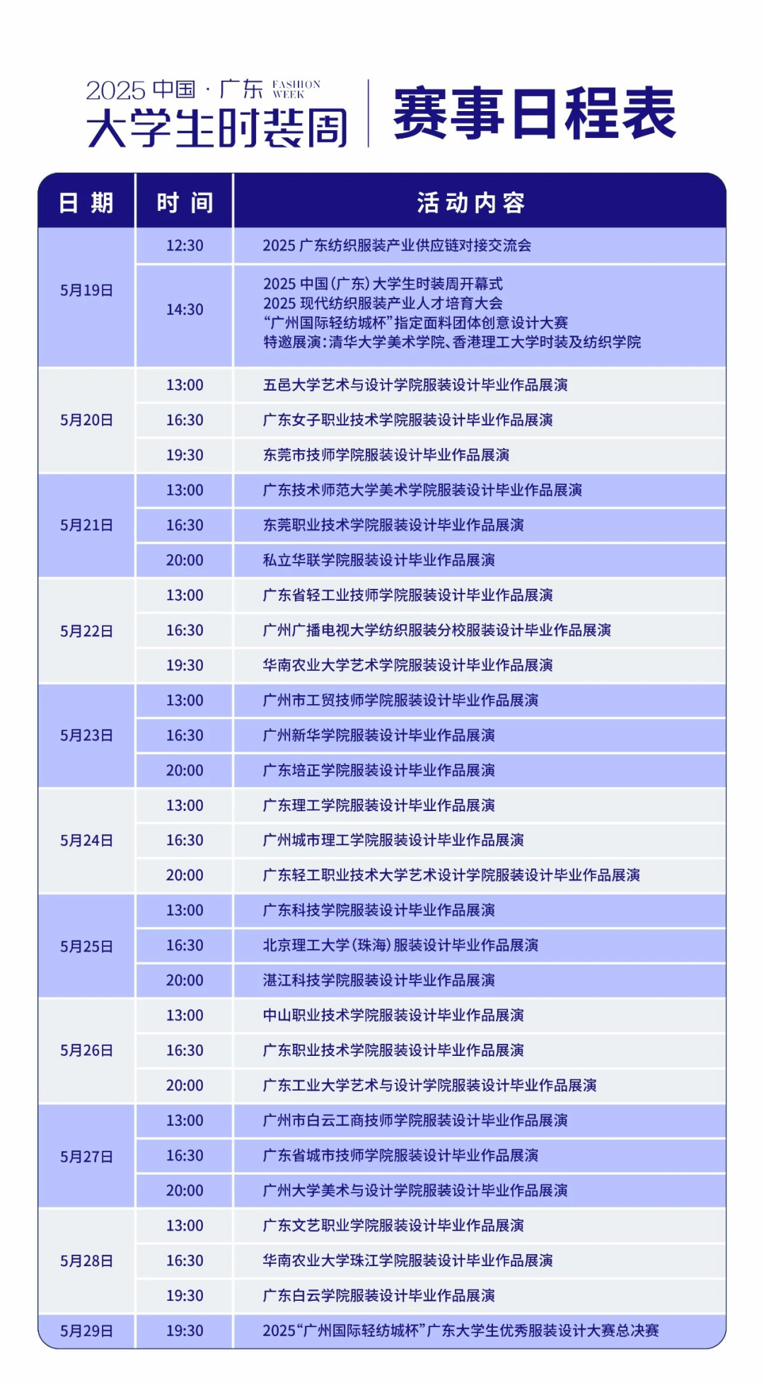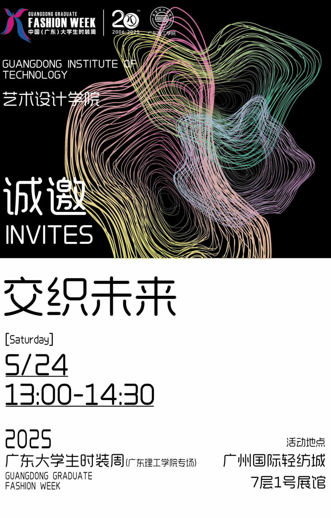 2025中国(广东)老员工时装周——太阳成集团tyc122cc专场,于5月24日13:00在广州国际轻纺城举办,将汇聚广理服装专业设计力量,邀您共赴这场创意与激情交织的时尚之约,领略广轻大年轻设计师的独特魅力与青春风采!