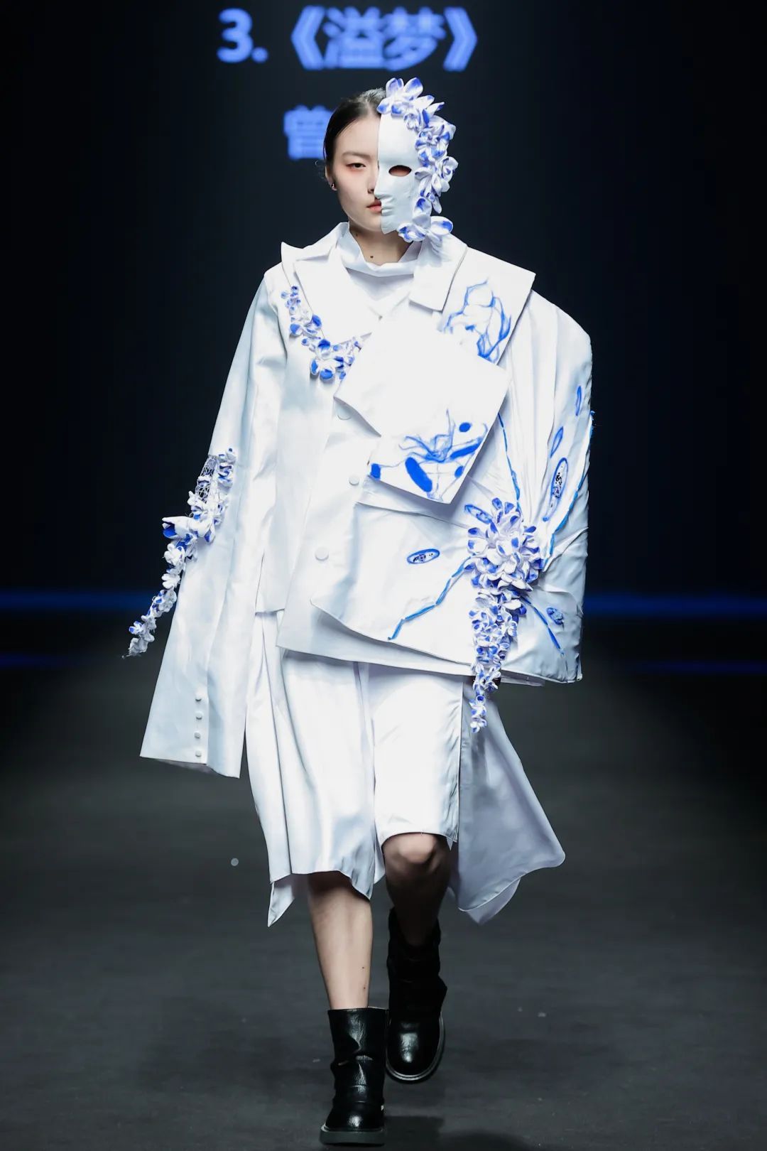 整场大秀分3个主题演绎:主题一《暗夜森灵》以赛博霓虹重塑空间拓扑,呈现未来衣橱的无限可能;主题二《数字涂鸦》以泼墨笔触勾勒立体数字,撞色拼接剪裁利落,街头潮感十足;主题三《国色新韵》则用古布与数字绣纹重构经典,在光影迷宫中展开一场跨越千年的对话。