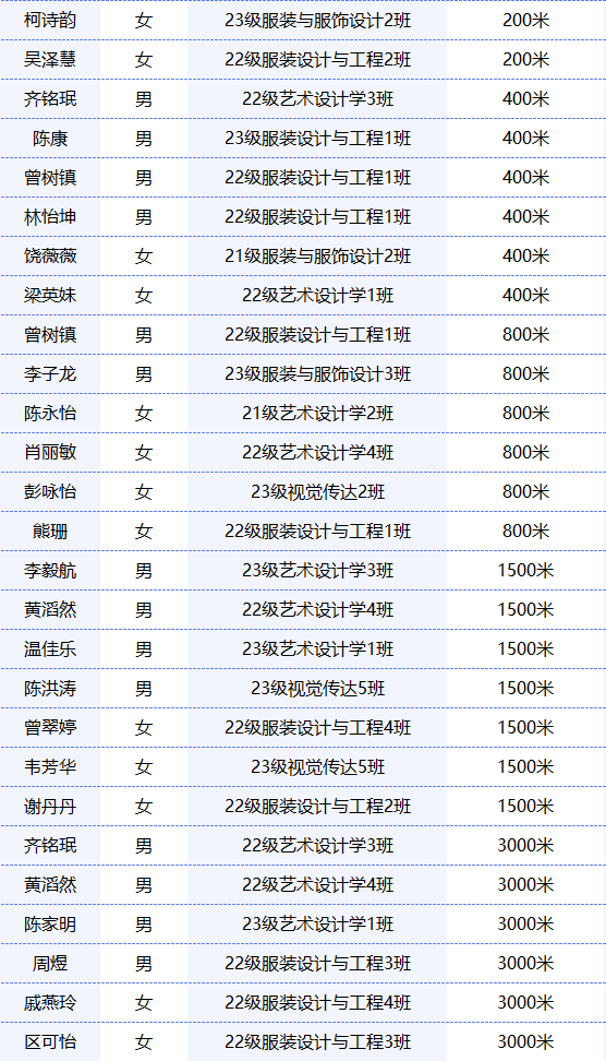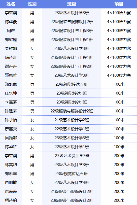 最后恭喜以上同学入围校运会比赛,祝运动员们都能赛出风格赛出水平,谱写热血竞赛新篇章。