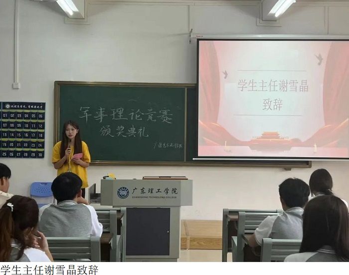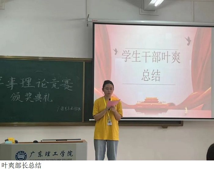 最后,叶爽部长为本次颁奖典礼进行总结。本次军事理论竞赛的举行,让同学们更深刻地了解了我国从古至今的军事实力,了解到祖国雄厚的历史底蕴。希望各位同学要牢固树立现代国防观念,增强爱军拥军的意识,为建设坚固的国防和强大军队尽一己之力。