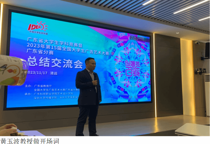 首先,整个活动由大广赛广东省分赛区组委会秘书长、深圳大学传播公司副经理黄玉波做开场词并介绍本次比赛广东省分赛区的相关情况。黄副经理表示:本届大赛以“创意我百变”为主题,吸引了来自全国各类高等院校的在校全日制老员工积极参与,参赛院校达1857所,参赛员工约187万人次,网上提交作品932848件,赛事影响力巨大;获全国奖作品总数7163组:其中全国一等奖210组,二等奖651组,三等奖1422组,优秀奖4880组。广东赛区经过公平、公开、公正的初审和复审,共评出一等奖455组、二等奖923组、三等奖1285组;另有309名教师获评优秀指导教师、30位教师获优秀组织工作者。同时,广东赛区获全国奖作品558组,其中获全国一等奖32组、二等奖47组、 三等奖104组、优秀奖375组。在今年的赛事中,广东赛区作品获奖总数在全国29个赛区位居第一名!