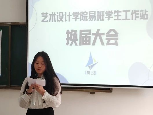 首先,主持人介绍出席老师及嘉宾,宣布换届大会正式开始。由蔡文锋老师致开幕词,对即将离任的工作人员表示衷心的感谢和崇高的敬意。同时,对即将接任的新一届工作人员表示热烈的祝贺和诚挚的祝愿。再者,由22届站长孟婷致辞,她说道:今天很荣幸能站在这里致辞,时光荏苒,光阴如梭,归功于指导老师蔡文锋老师不辞辛劳的关怀和勉励,更归功于易班每一位成员的不懈努力许多情景仍历历在目,难以忘怀。最后,师姐希望学弟学妹们栉风沐雨,砥砺前行。