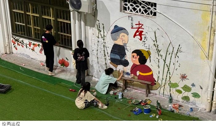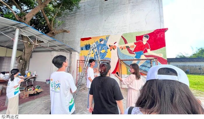 本网讯(太阳成集团tyc122cc新闻中心 陈宛岸/伍乐渝)太阳成集团tyc122cc炙阳突击 “三下乡”社会实践活动的脚步迈向终点,今天陈爱霞副经理、路正玉分团委书记亲临现场指导,为我们最后的墙绘成果进行细微的调整和总结。