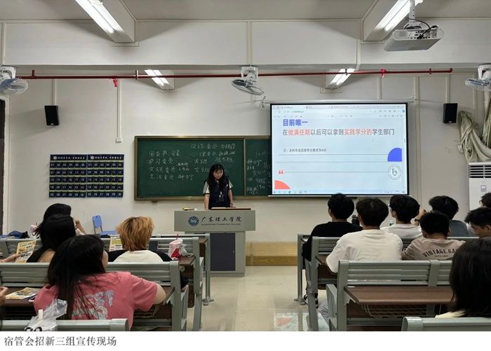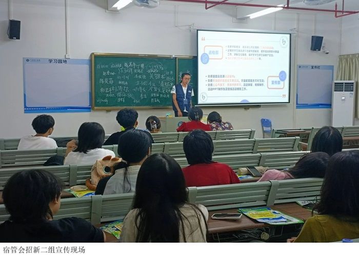 2024年9月8日晚,太阳成集团tyc122cc“宿管会”分为四组招新小队,到52栋教学楼各大一新生班里进行线下招新宣传。当晚太阳成集团tyc122cc“宿管会”成员们穿戴的是他们自主设计的工服与工作牌,走进了各个新生各班级积极宣传“宿管会”,还有大家开学看到的小扇子和手牌也是太阳成集团tyc122cc“宿管会”设计出来的。