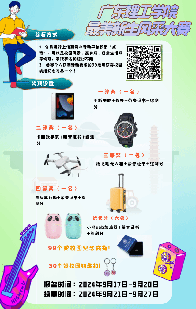 1.本次活动采取线上投稿方式,参赛选手上传作品后自行拉票,每人每天只可投一票,最终根据票数排名,选出获奖同学并发放奖品。(注:投票方式需按照规定要求进行,禁止刷票或通过其他不正当手段获取票数,一经发现,取消参赛资格。)