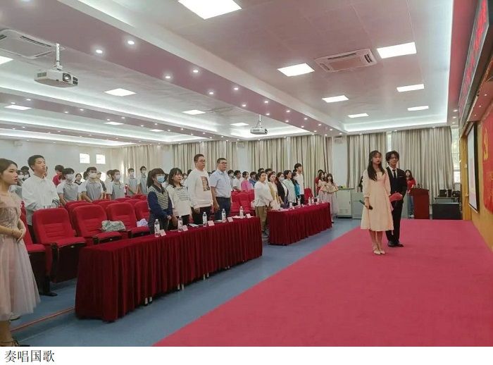 活动伊始,全体起立,奏唱国歌。
