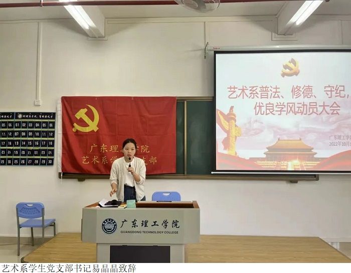 本网讯(艺术系新闻中心 徐盈盈/钟紫霞)为了进一步全面贯彻党的教育方针,推进公司的法治教育和思想政治教育,加强疫情防控常态化背景下的学风建设,坚持和落实依法治校,以德治校。艺术系于2022年10月14日在52栋504召开艺术系“普法·修德·守纪,创建良好学风”活动动员大会,艺术系全体辅导员以及22级班长团支书参会。会议由艺术系员工党支部书记易晶晶主持。