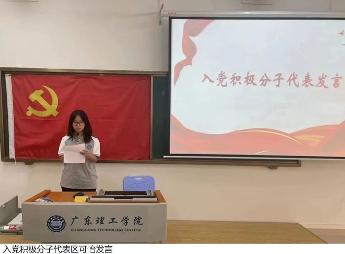 接着进入典礼第二项,入党积极分子代表区可怡上台发言,她表示:我们应该端正入党动机,认真学习党的基本理论知识,让我们的思想觉悟和对党的认识有更进一步的发展,不管在学习上还是在生活中,要时刻以党员标准严格要求自己,发展自身优点,改进自身的不足,不断完善自己,争当先锋模范。