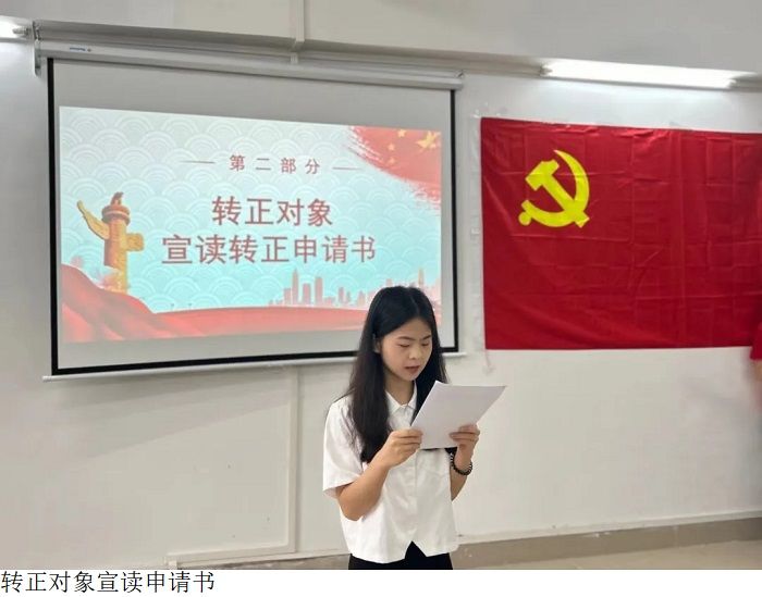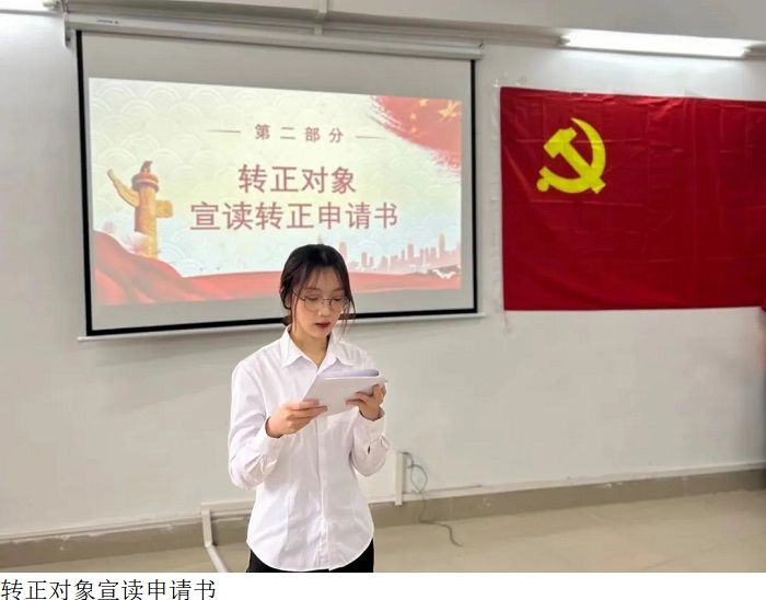 会议第二项:转正申请人尤嘉,陈茵琪,庄浩然,邹宜含,陈晓彤,林诗思,江绮莎,何章颖8名同志对自身在预备期一年内的思想、学习、工作、生活等方面的表现、进步、存在的问题和改正措施进行了个人汇报,并宣读了转正申请。他们表示,转正后会严格按照合格党员的标准要求自己。不断加强自身政治理论和党性知识的学习,提高自身政治素养,牢记全心全意为人民服务的宗旨,把人民放在心中最高位置。