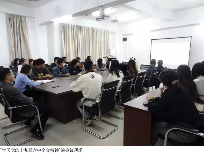 本校讯(艺术系宣传部 邓堪柳)2021年11月15日中午12点10分,艺术系员工党支部于艺术楼会议室召开了关于“学习党的十九届六中全会精神”的会议,党总支书记赵宁、员工党支部书记易晶晶、员工二十七期建党对象及二十八期发展对象参会。