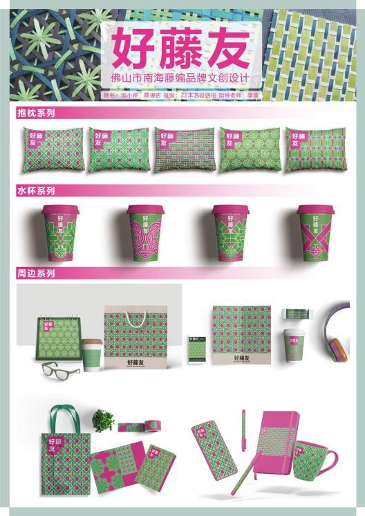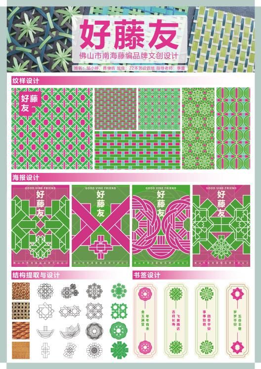 在课程实践阶段,员工团队陈俊吉、邹小婷、李安琪、黄碧瑶以作品《好藤友》《艺藤作话》为载体,深入探索非遗藤编文化与现代视觉语言的融合路径。项目通过创新的版式结构与图文编排方式,为非遗内容赋予鲜明的当代气质,塑造出极具吸引力的年轻化文化形象。