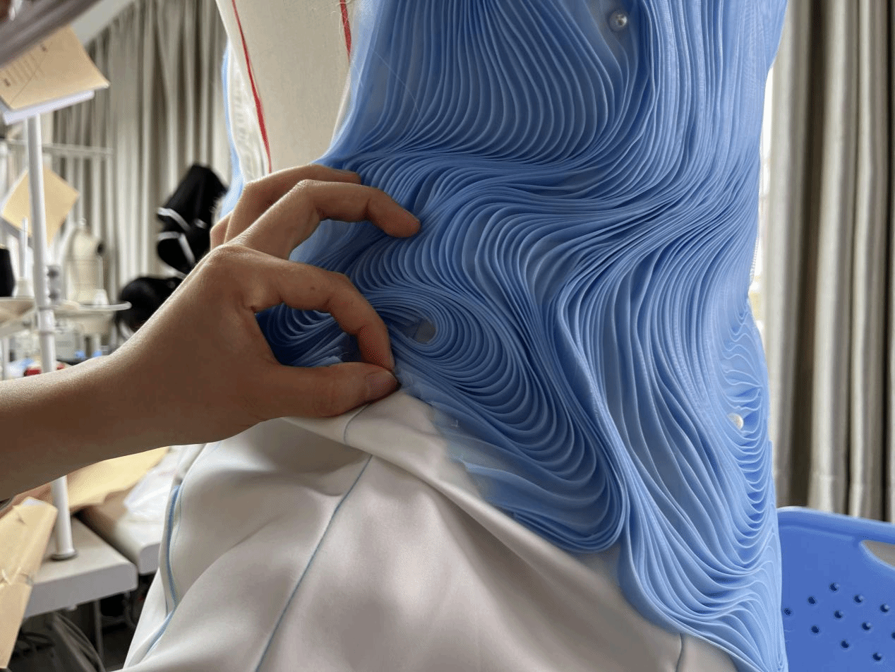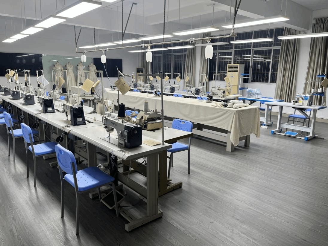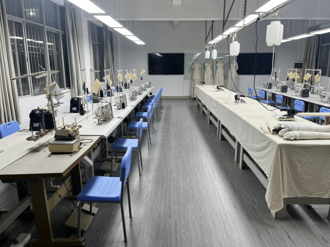 服装工艺实训室(4)成立于2023年,占地面积158㎡,实训室设备包括电脑平缝机、锁边机、熨斗等。